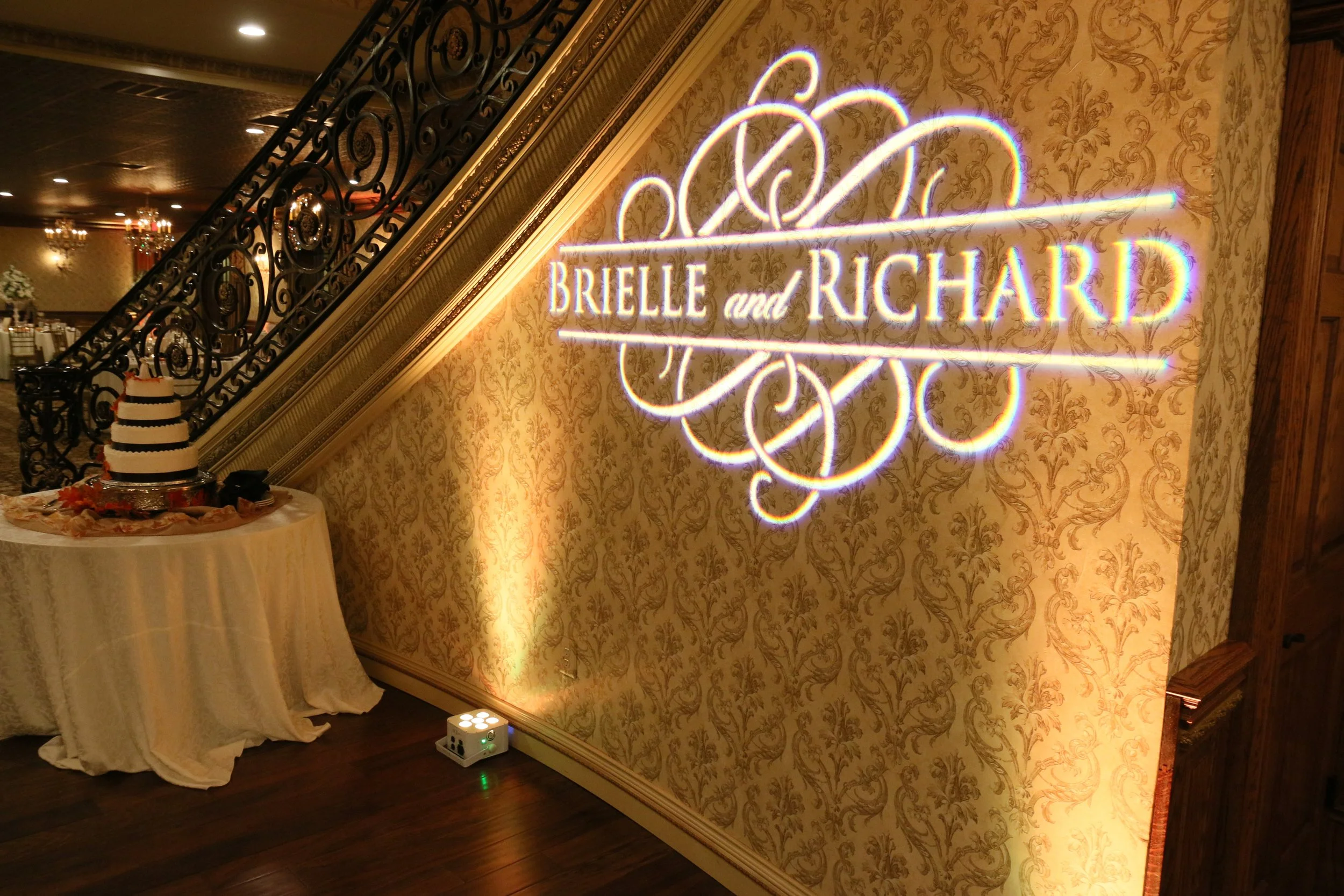 We can project your gobo, name/date/message, or company logo, relevant information or just about anything onto the dance floor, on a screen, or up against a wall. Sometimes called a “gobo projection” or “dance floor monogram”, we have multiple options to fit your style and/or budget.