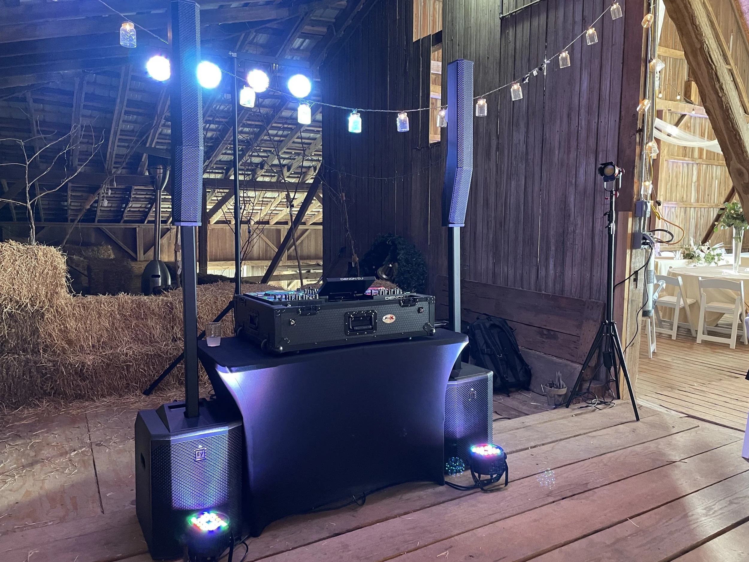 All DJ packages in this tier include an optional booth facade, pro Shure wireless microphones, DJ system, and simple dance floor lighting.